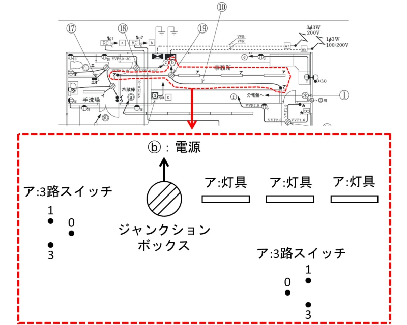 複線図を書くと「ア」につながる3路スイッチの配線と分かります。