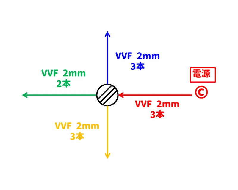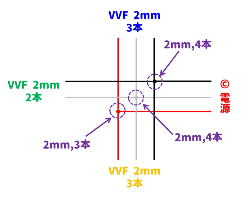 複線図で書いてある電線はすべて2.0mmのVVFケーブルですので、2.mmケーブル4本の組み合わせが2か所、2.0mmケーブル3本の組み合わせが1か所になります。