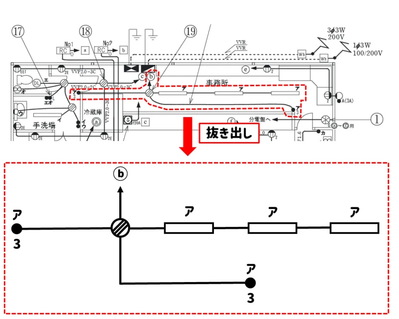 配線図から複線図を書いて、電線の組みあわせとリングスリーブの関係から考えていきます。