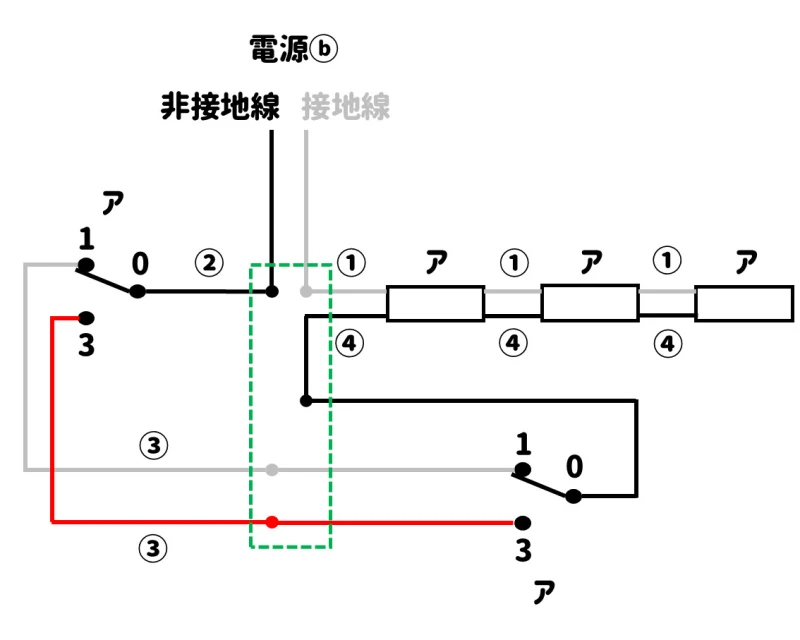 複線図を書くとb側と3路スイッチの2本接続が1ヵ所、照明とb側の2本接続が1ヵ所、3路スイッチ同士の2本接続が計3ヵ所の